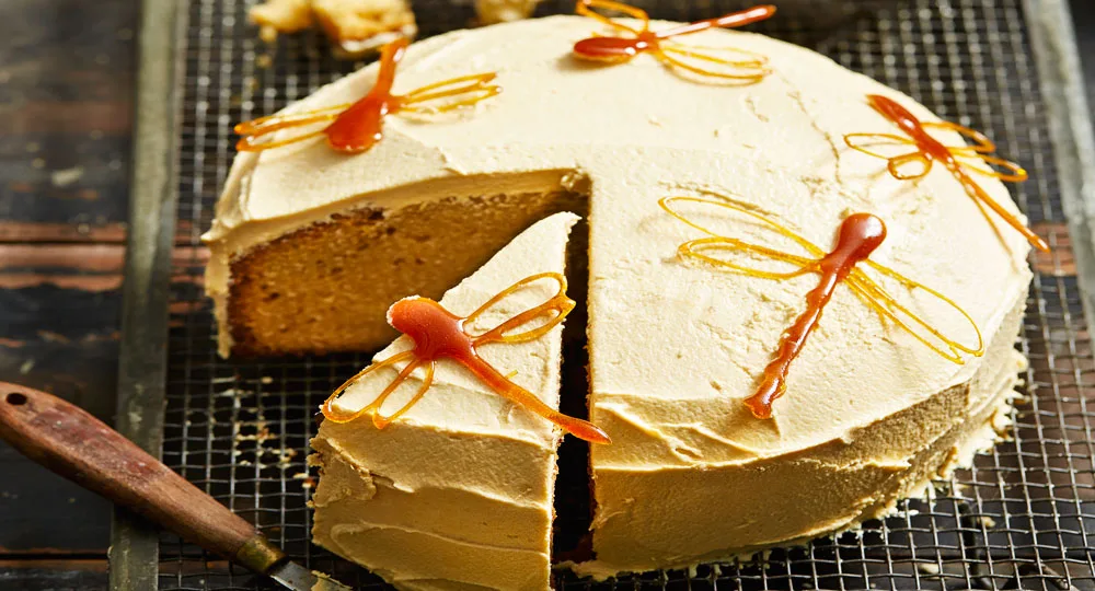 Transfer cake to a serving plate. Spread buttercream icing over top and side of cake in a thick layer to coat. Decorate with toffee dragonflies to serve.