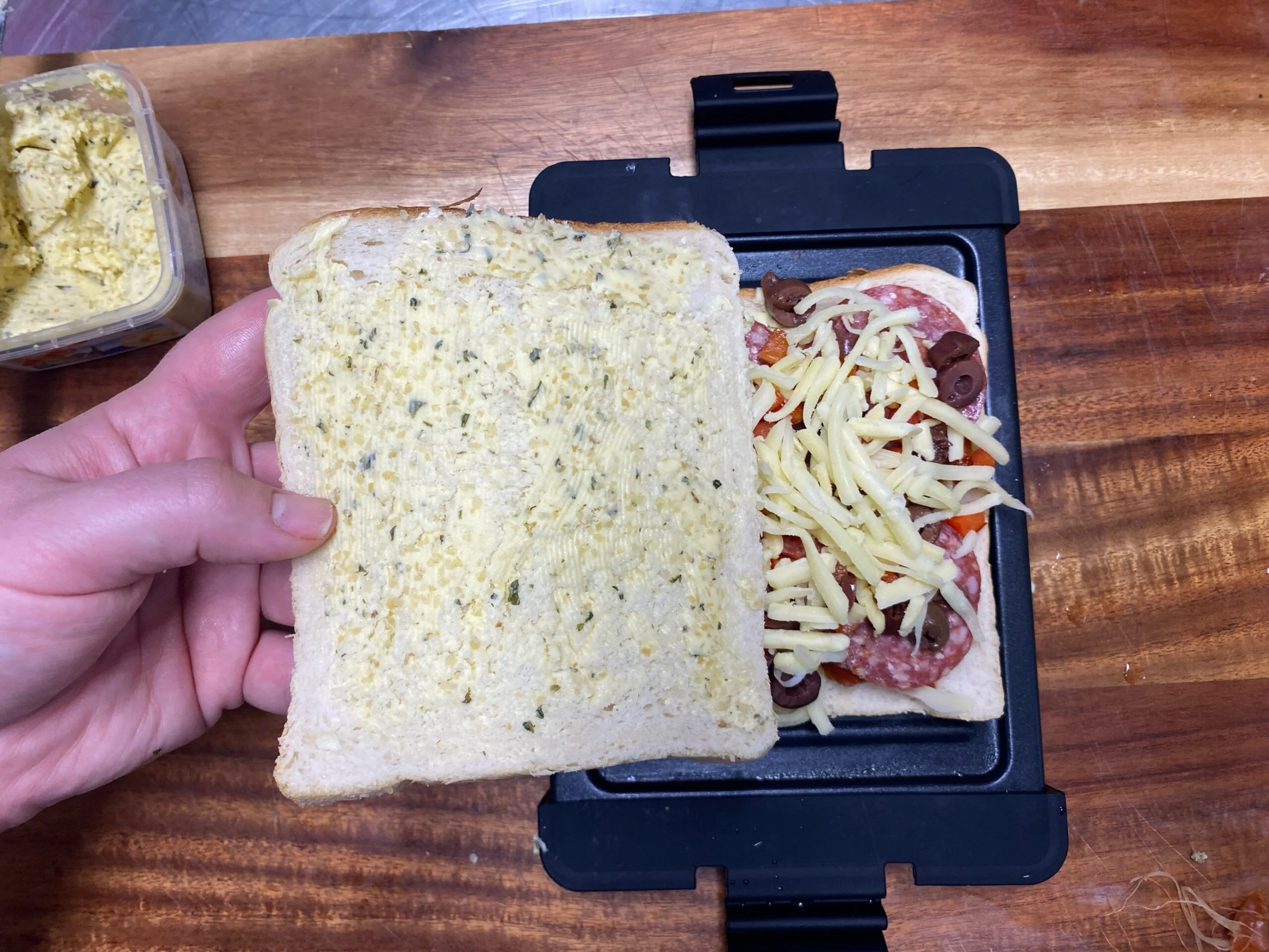 The microwave grill is larger than the original microwave toastie maker. So, we decided to try making a pizza toastie to begin. We used larger slices bread and lathered the outside in garlic butter, before adding cheese, pizza sauce, salami, olives and capsicum. The verdict?